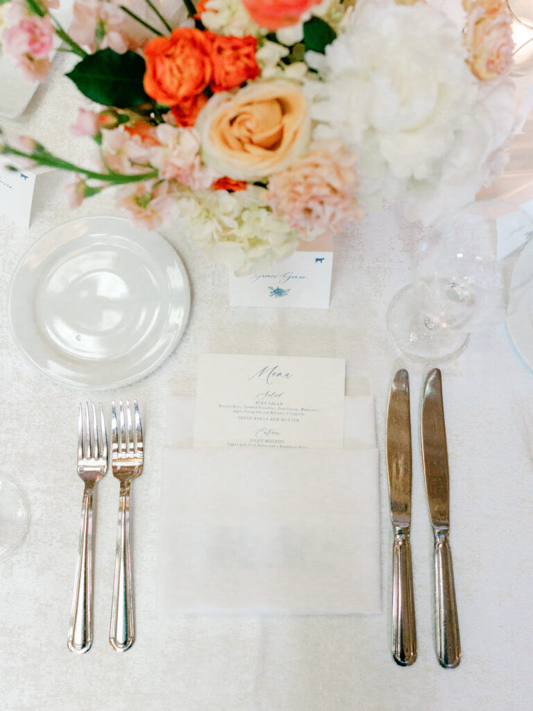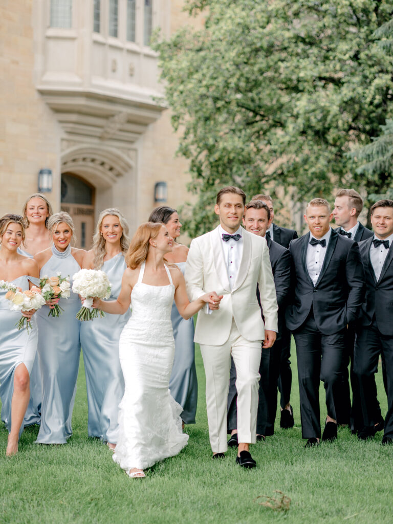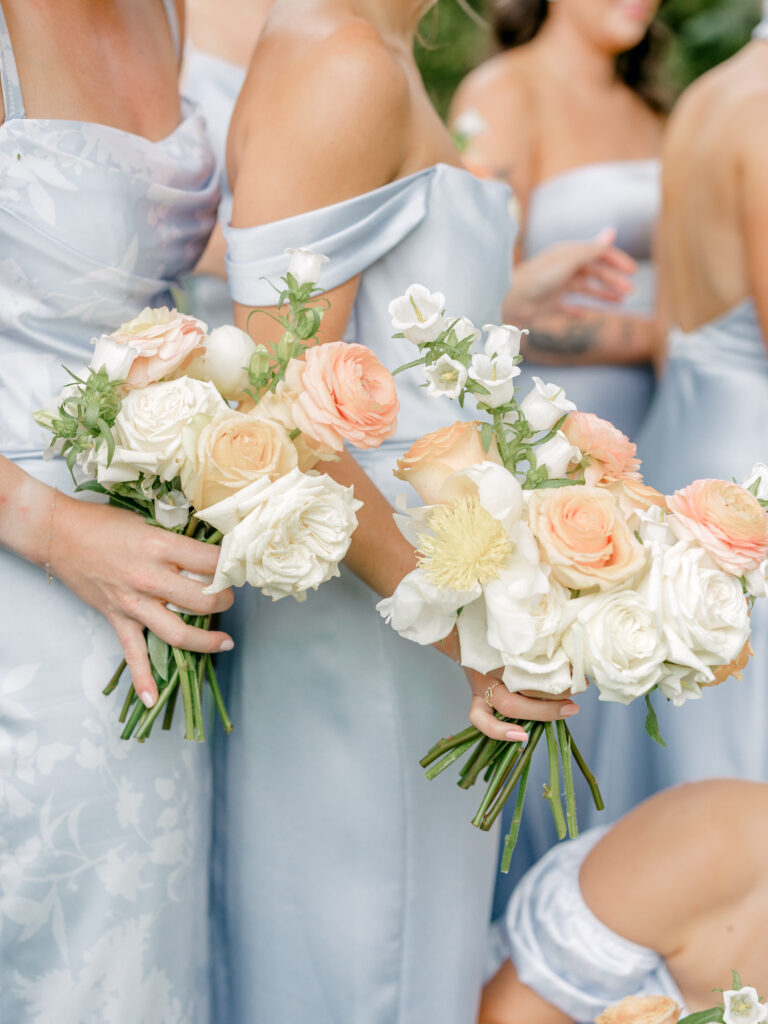 Speaking of luxury, the bridesmaids wore luxurious gowns in a curated mix of soft blue tones and textures, a color story that gave the whole wedding a light, breezy elegance reminiscent of a coastal celebration. And you know I love a coastal color story! Having mix-and-match bridesmaid dresses gives a wedding party a refined, high-end appearance. I’m starting to see this fashion choice a bit in Minnesota but I’d like to see it more often at Midwest weddings.