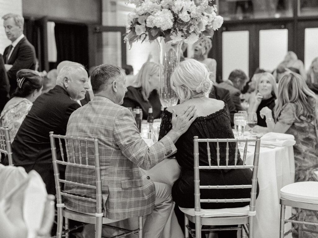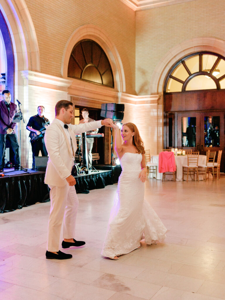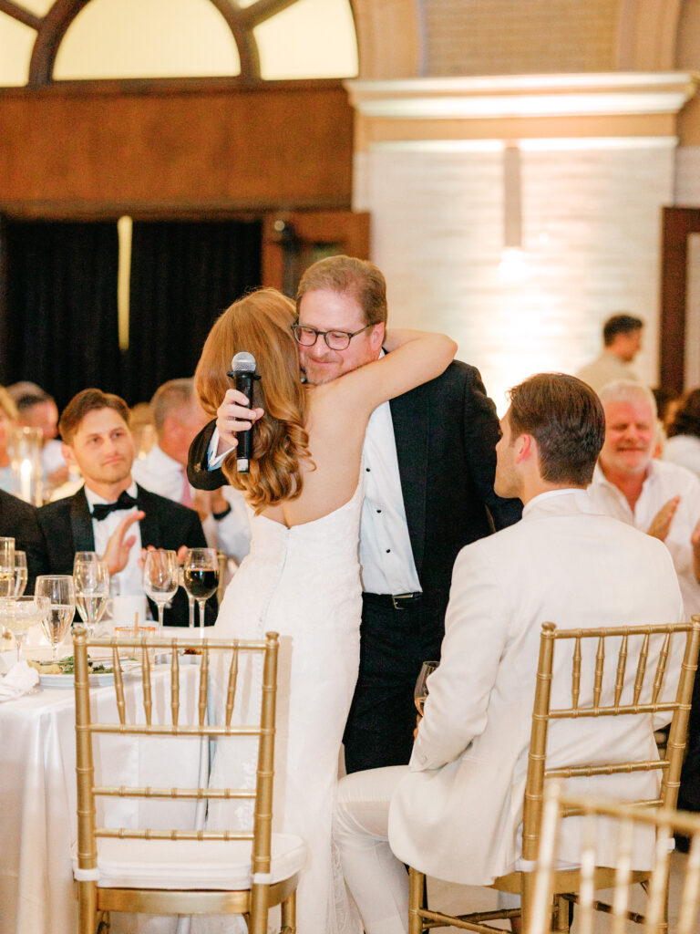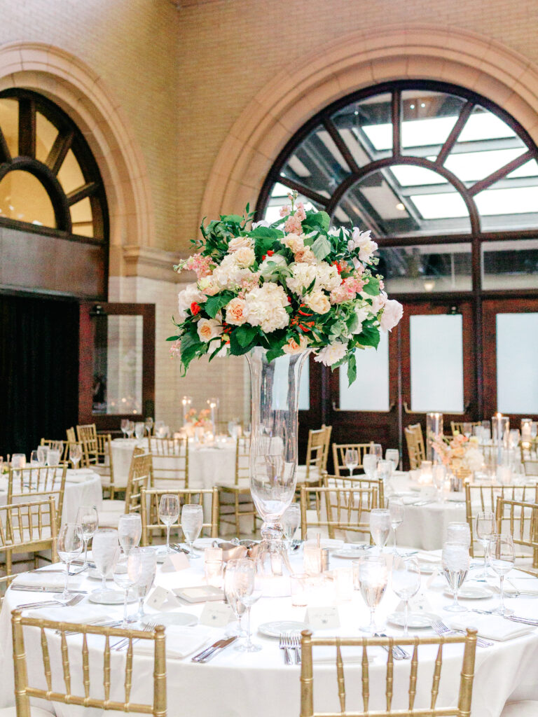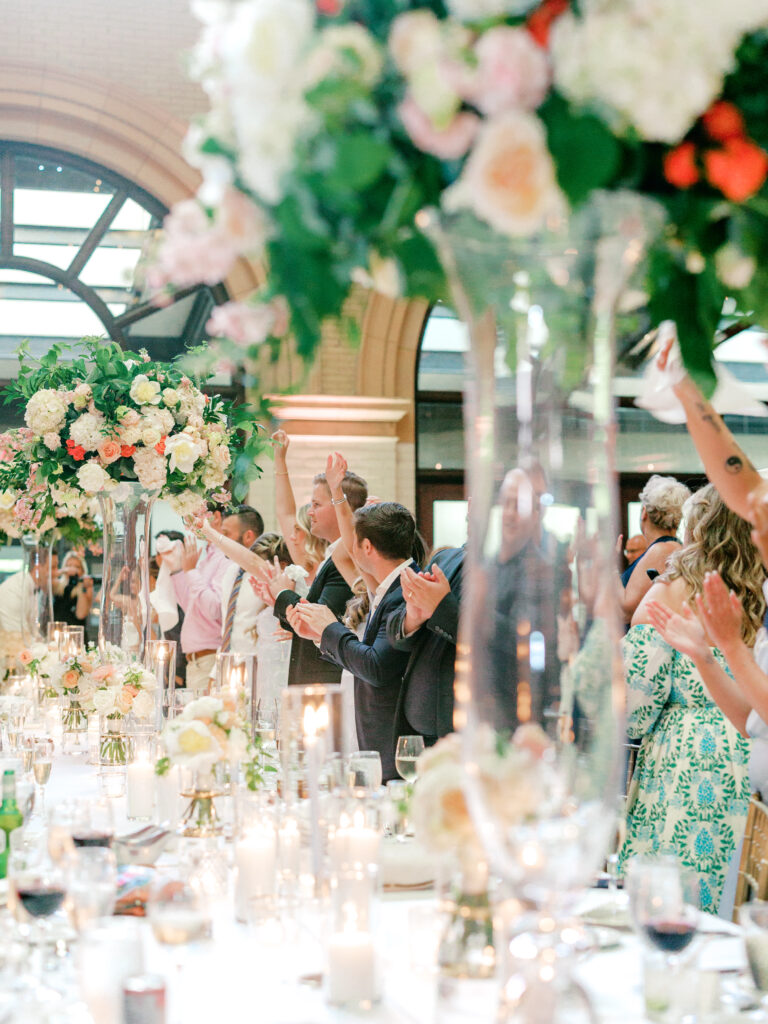Shortly after the ceremony, we arrived at The Depot Minneapolis for AnnaRose and Jake’s reception. The floral installations, thoughtful table décor, and warm candlelight softened the venue’s grandeur in the most romantic way. Even the simple decor in the cocktail hour space helped tie everything together with a subtle, cohesive beauty.