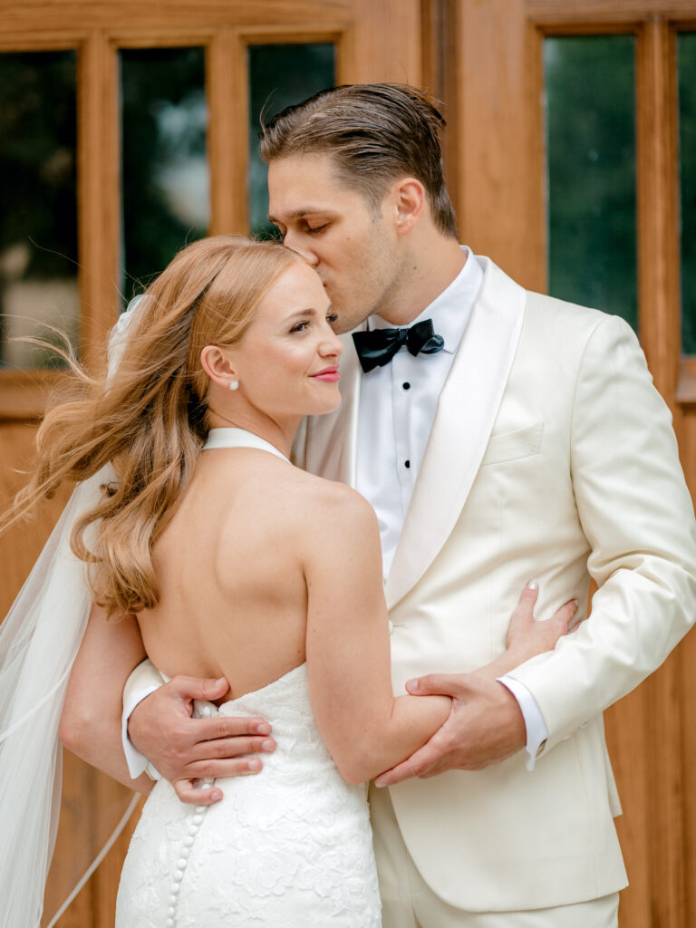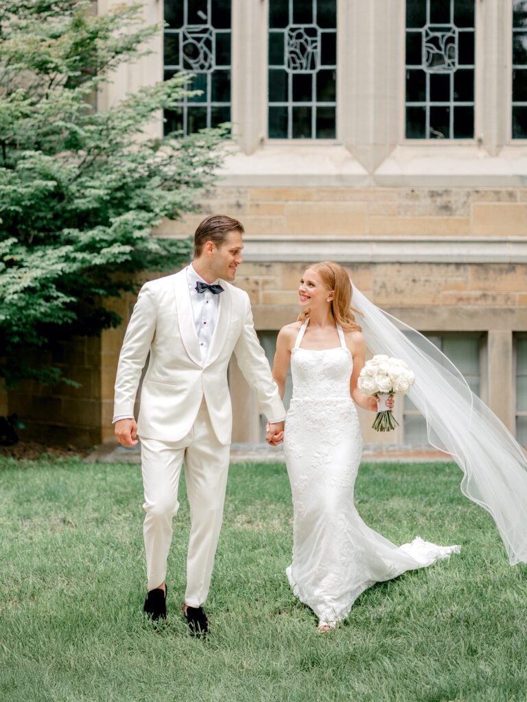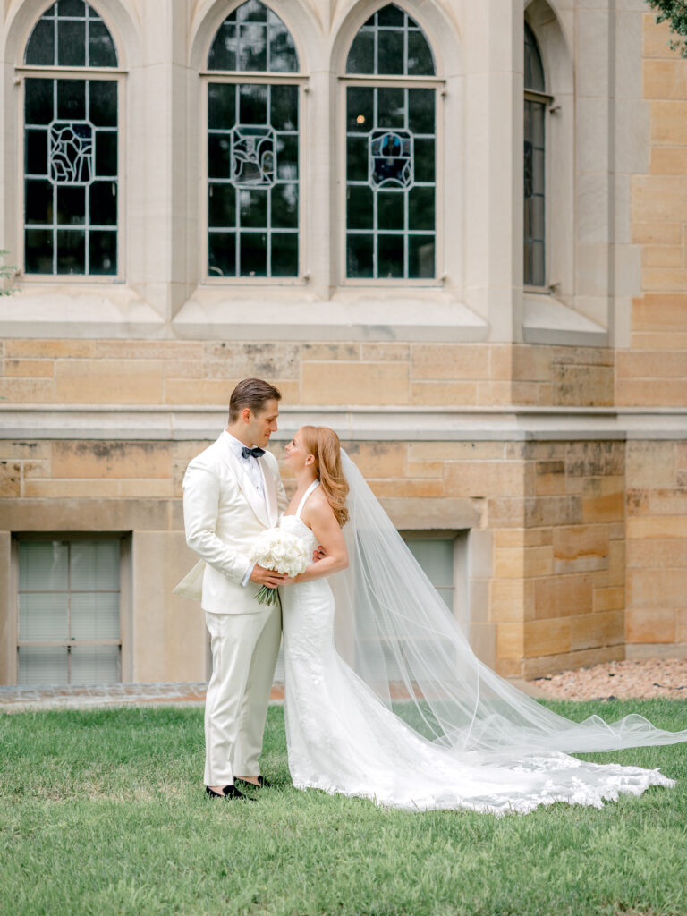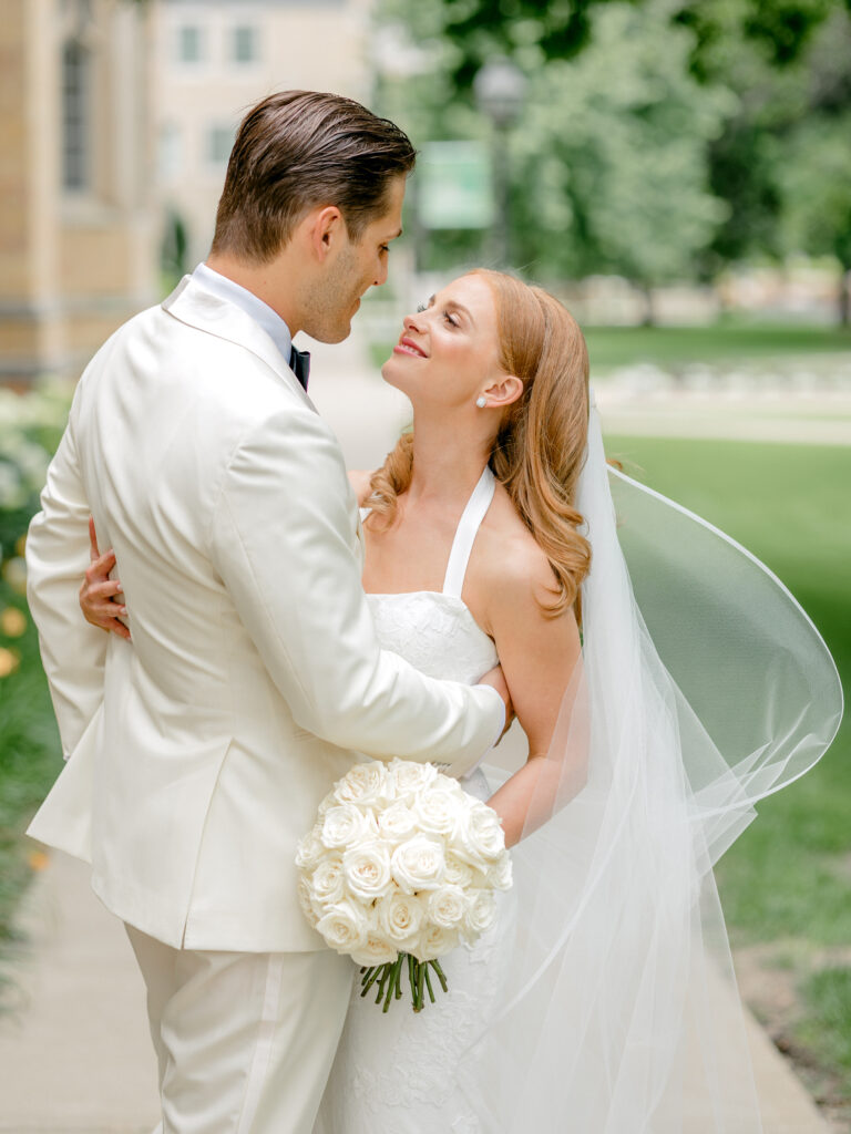 After their first look, we stepped into the peaceful courtyard on the University of St. Thomas campus for portraits. The ivy-covered buildings, stone archways, and manicured paths created an elegant, classic, and charming backdrop. It’s probably one of the prettiest campuses in St. Paul, Minnesota, and a perfect location for luxury wedding portraits.