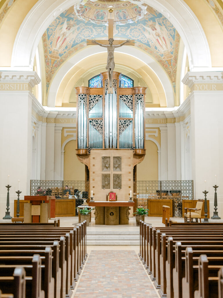 After the portraits concluded, AnnaRose, Jake, and their wedding party went into the chapel so not to be seen as their guests arrived. They had a traditional Catholic ceremony. But untraditionally, when it was time for the Eucharist, instead of sitting down, AnnaRose and Jake got up and handed out the Eucharist to their guests. It was a cool twist on a very traditional moment.