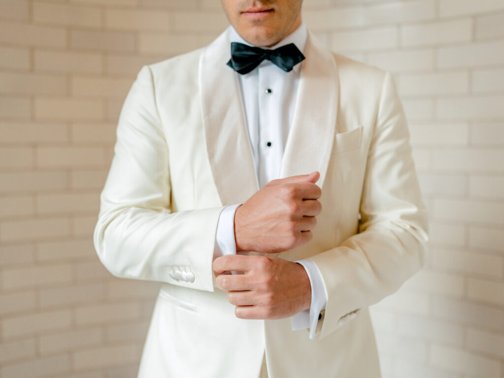 We began the day at the Renaissance Minneapolis Hotel, The Depot — the hotel conveniently connected to The Depot Minneapolis — where Jake got ready with his groomsmen. He wore a dapper white suit and classic black bowtie.